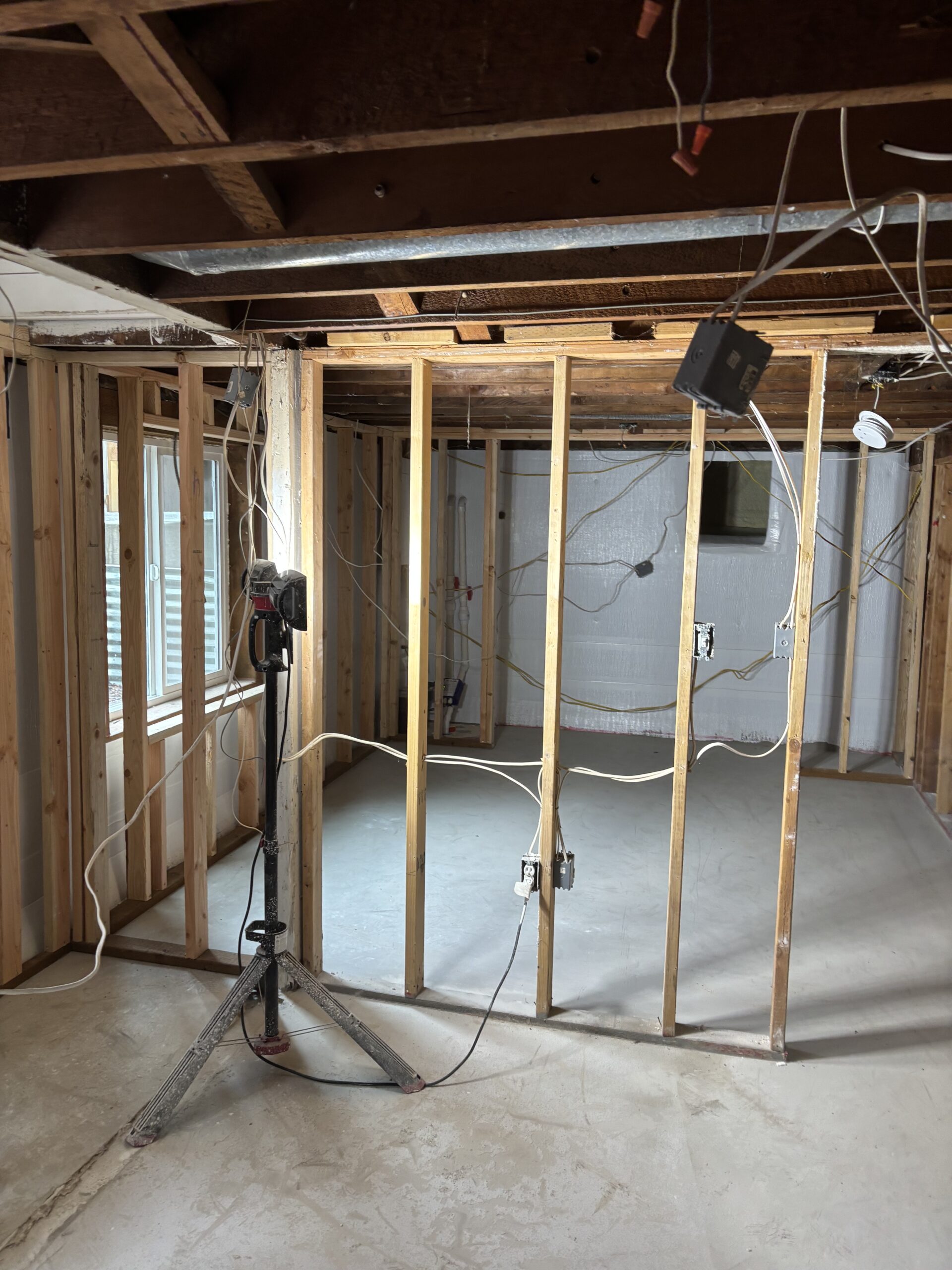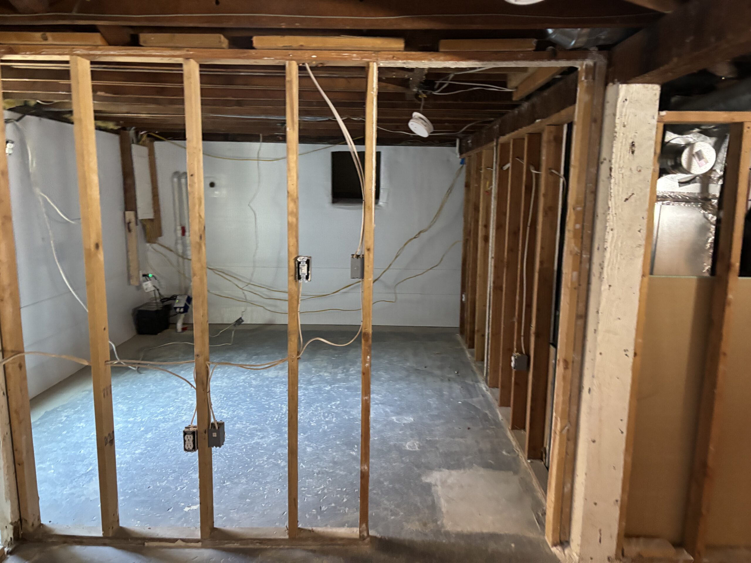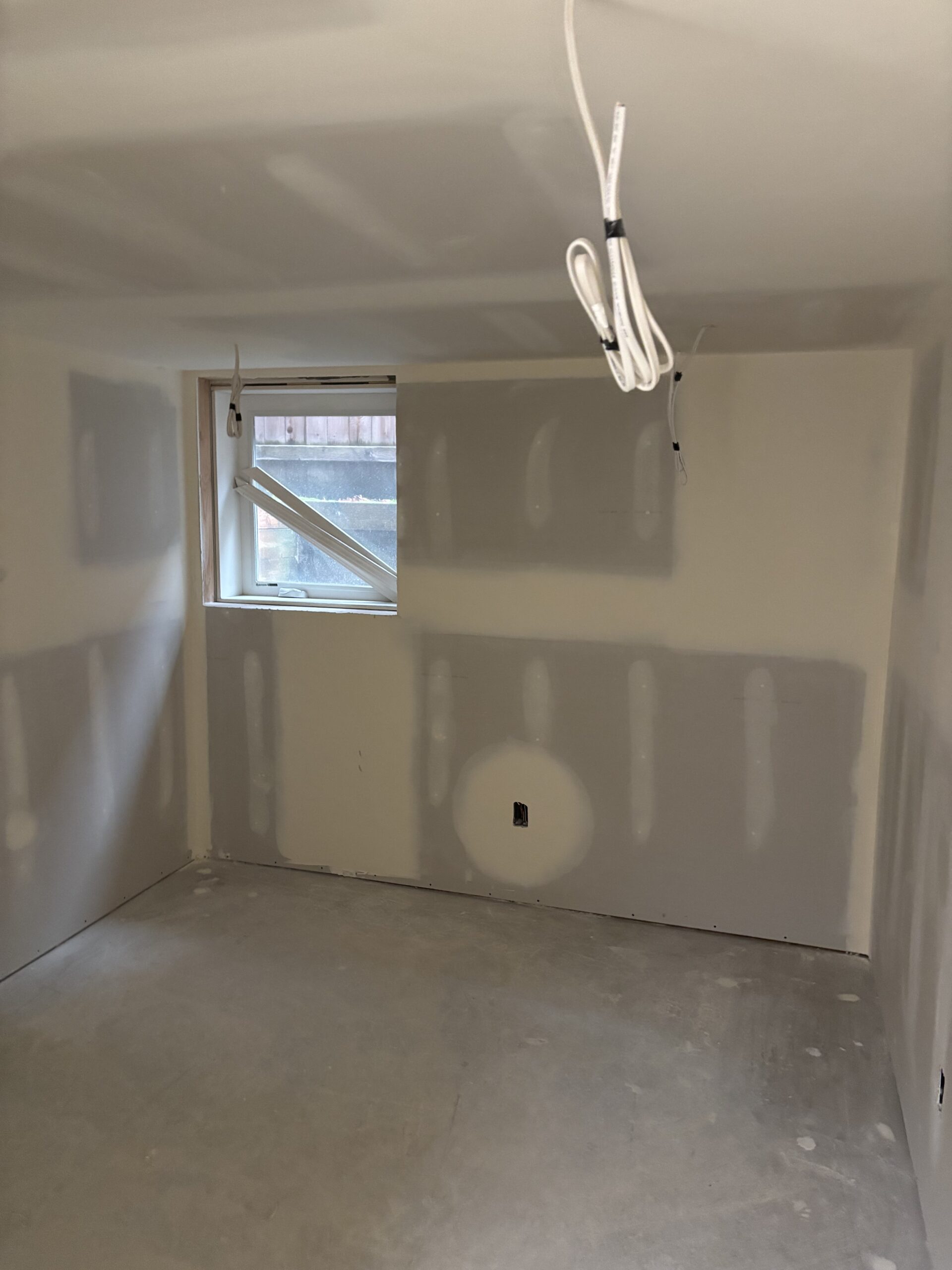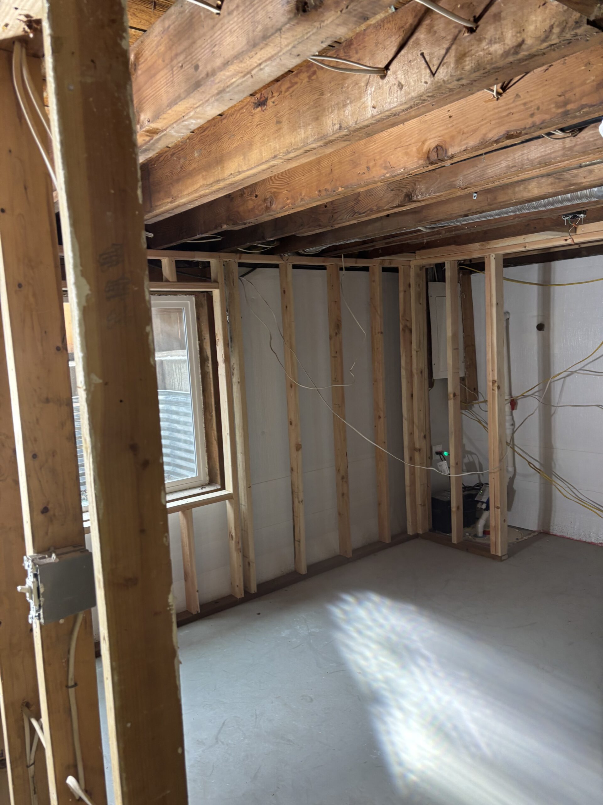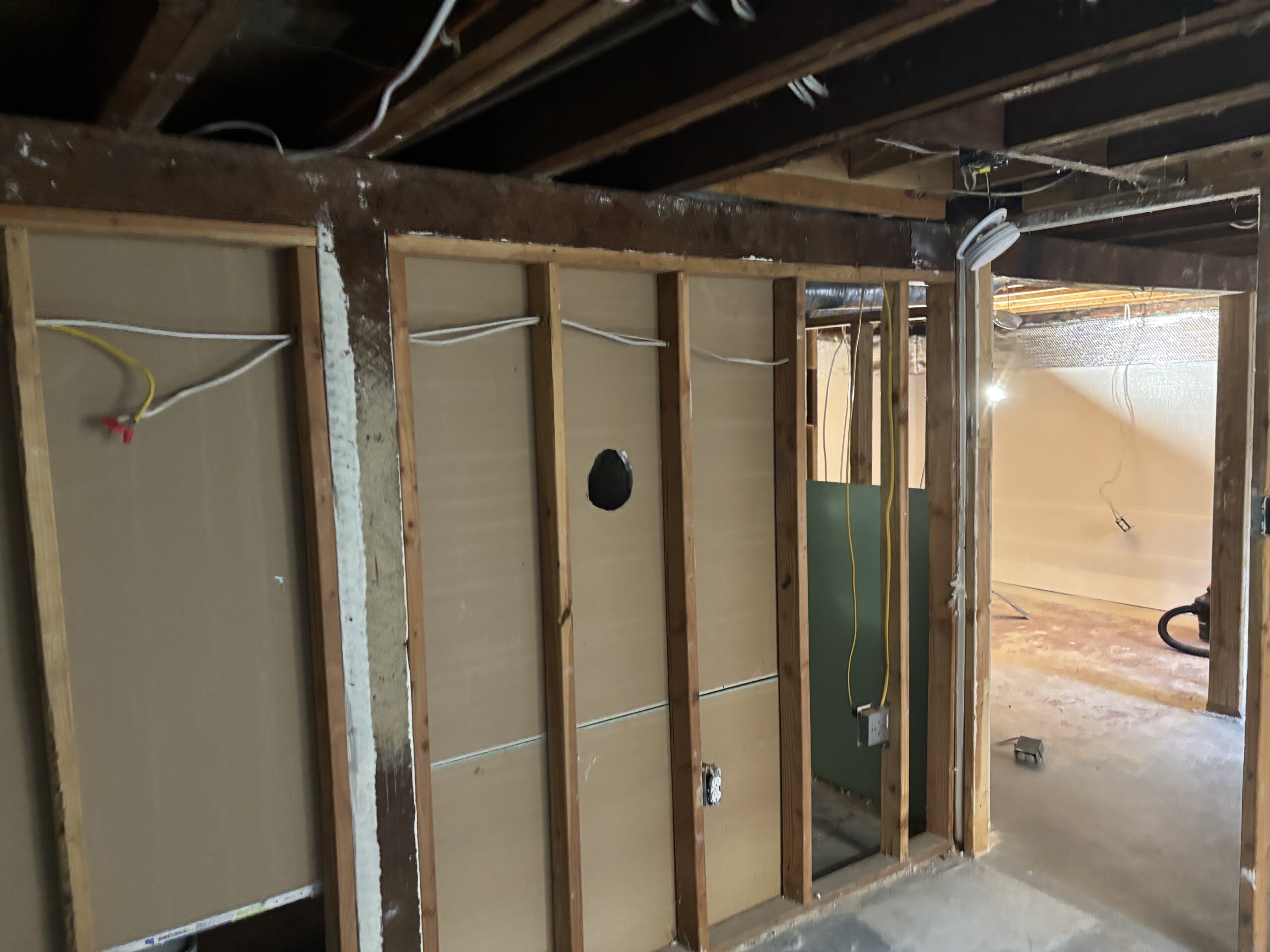 Framing, drywall and taping after basement waterproofing system and window well drainage system installation.