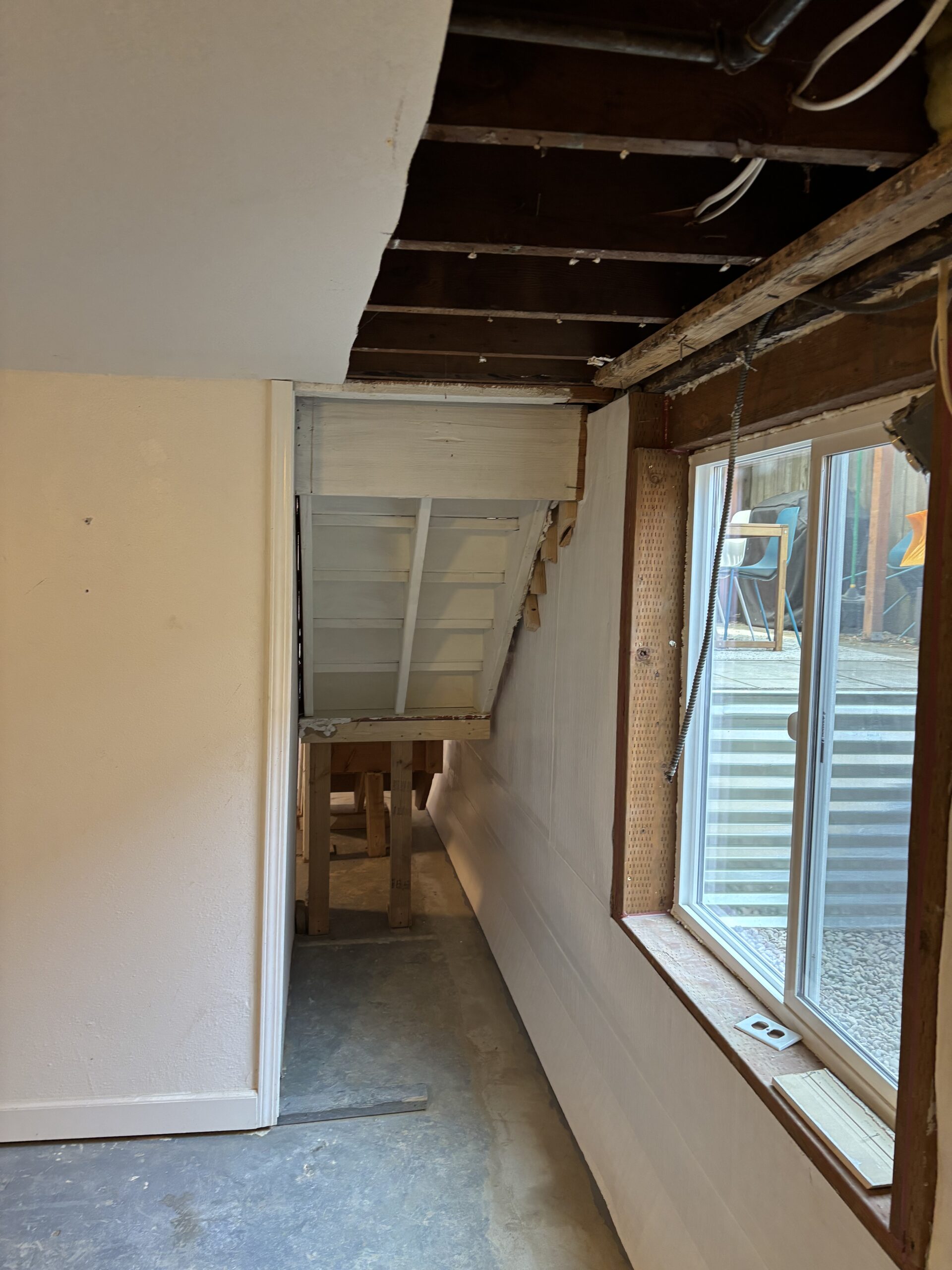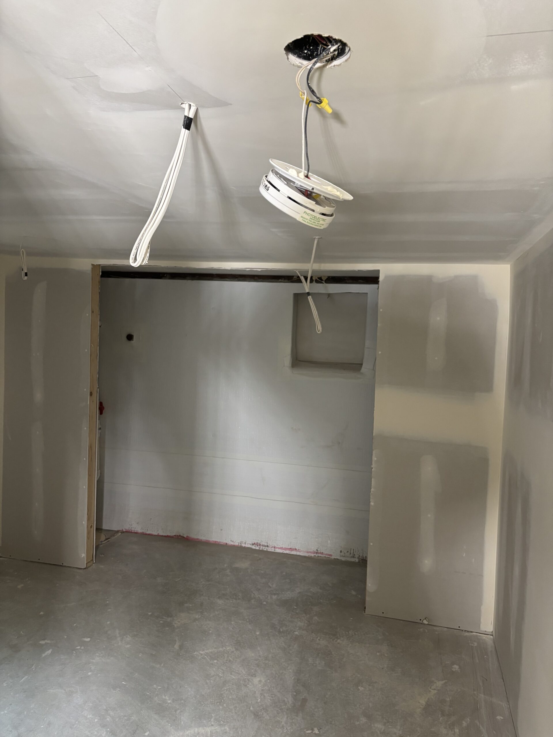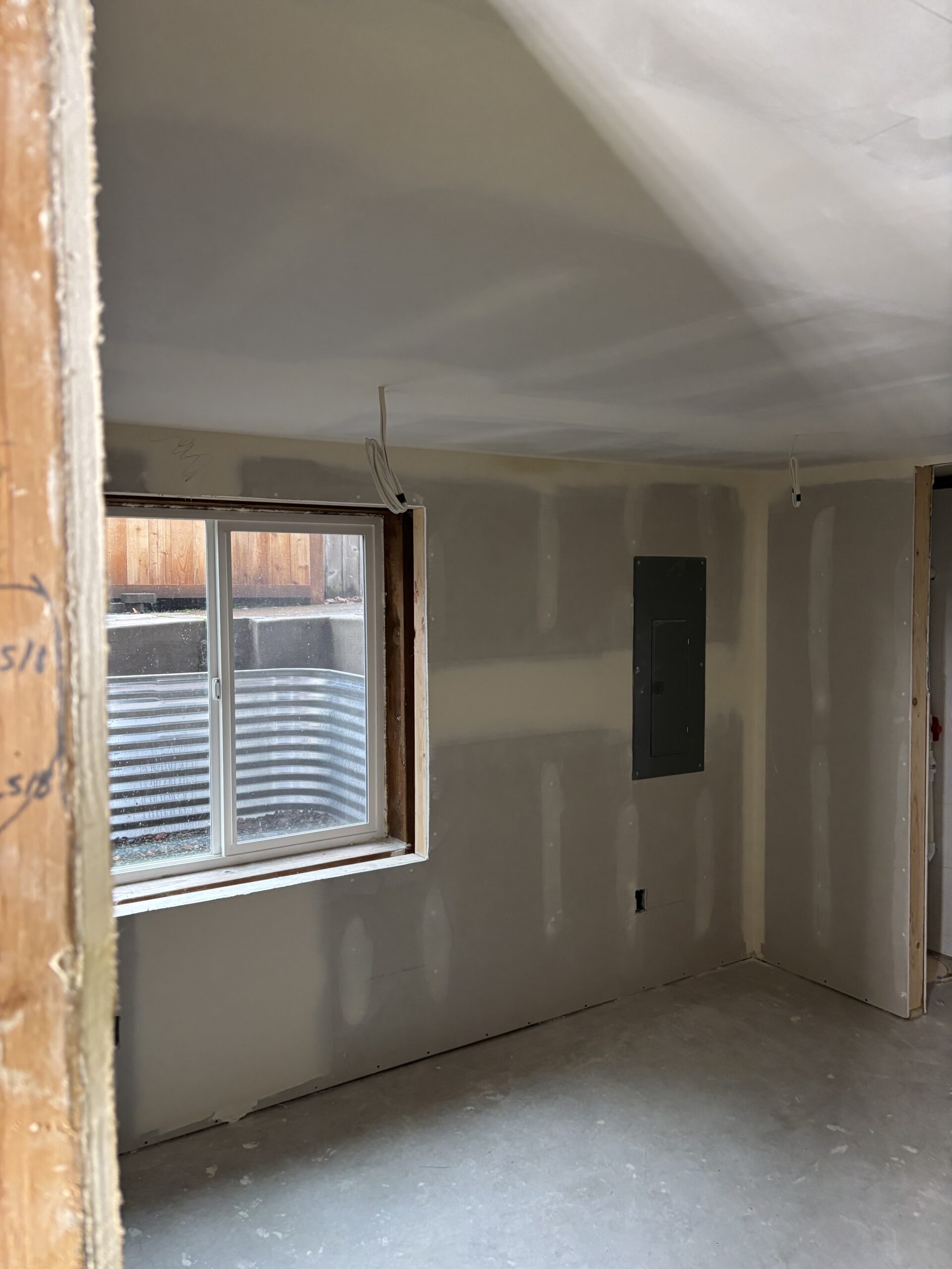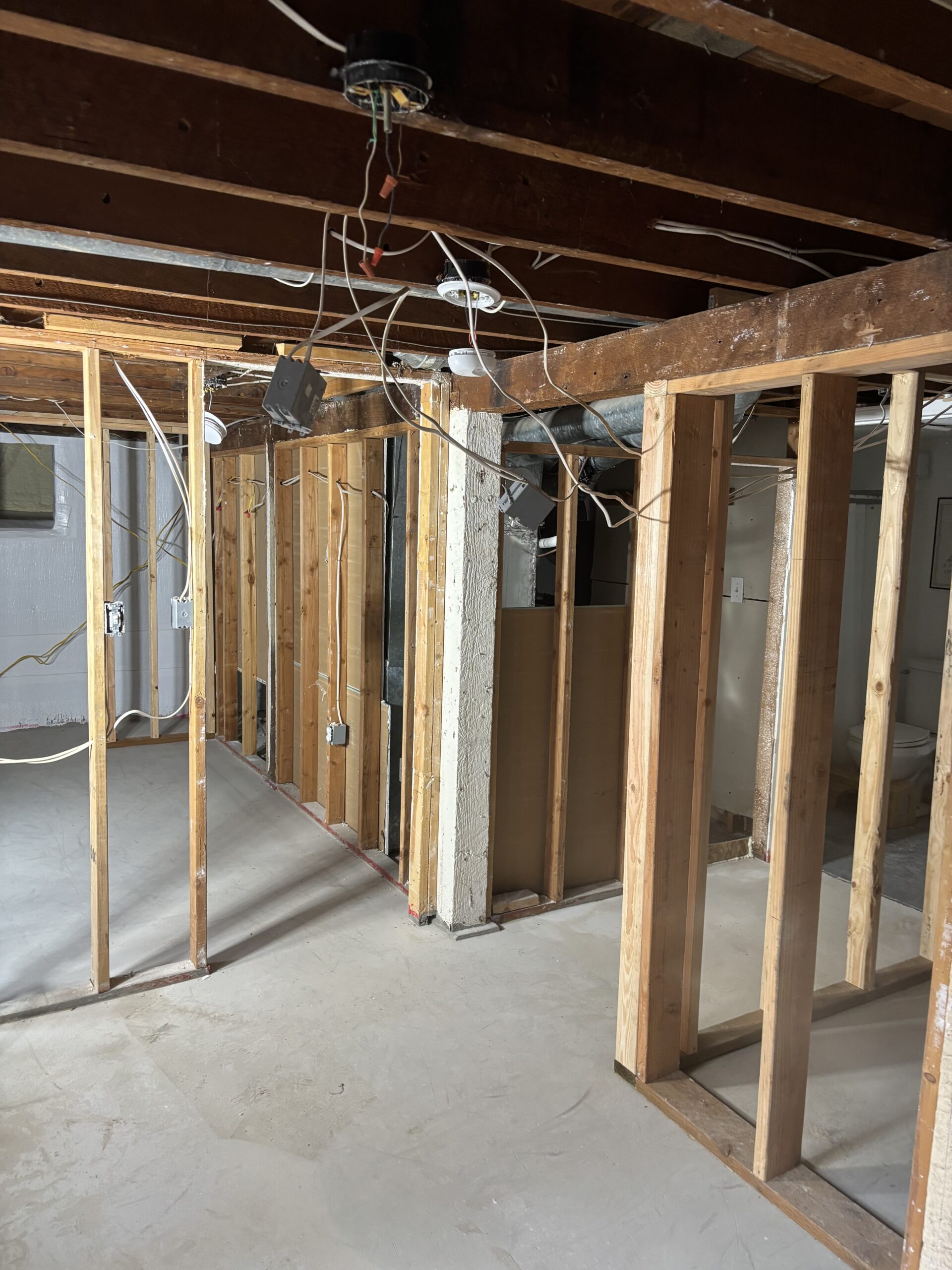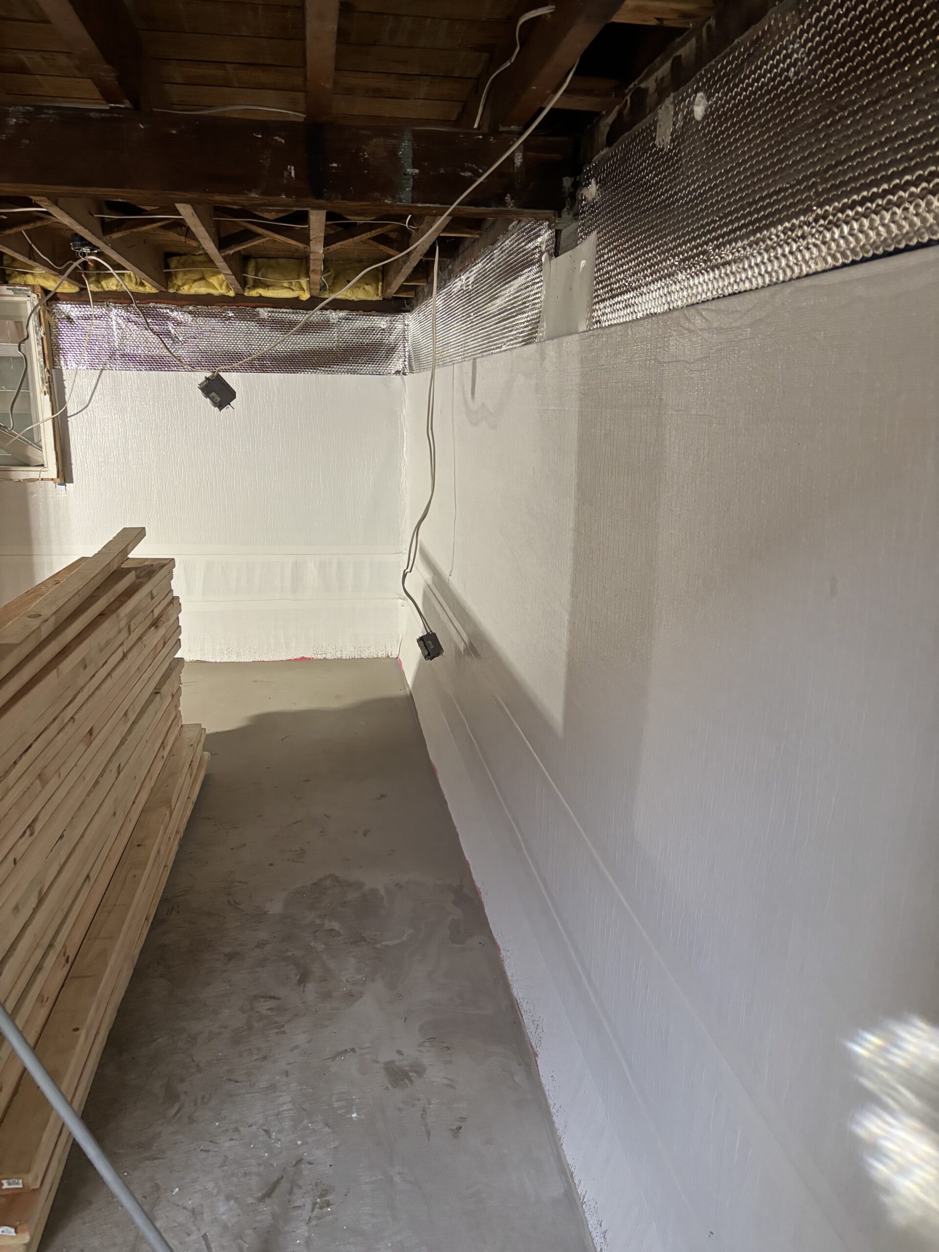 Framing, drywall and taping after basement waterproofing system and window well drainage system installation.